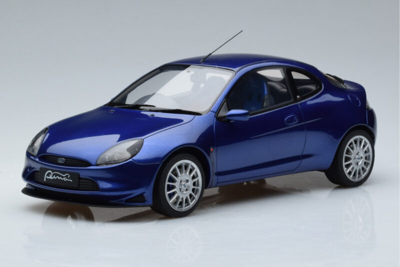 A 1:18 scale model measures approximately 25-28 cm (approximately 10-11 inches). The Ford Puma Blauw Otto 1:18 is perfect for display in a glass cabinet or on a shelf.