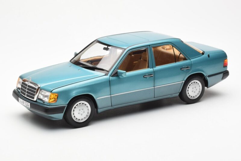 The Mercedes 230E W124 Beryl Metallic Dealer Editie Norev 1:18 is crafted from Metaal. Die-cast zinc alloy body with detailed plastic parts, rubber tires, and high-quality paint finish. Die-cast models are known for their weight, durability, and realistic feel.
