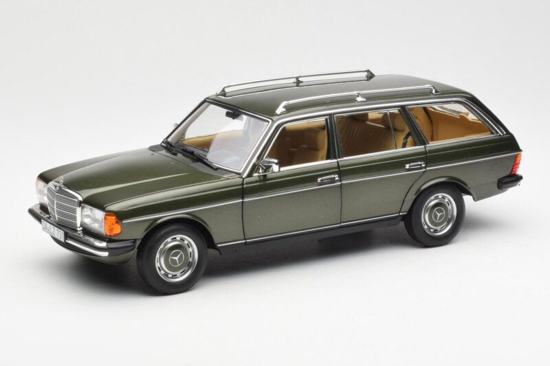 The Mercedes 230T W123 T-Model Groen Metallic Norev 1:18 is crafted from Metaal. Die-cast zinc alloy body with detailed plastic parts, rubber tires, and high-quality paint finish. Die-cast models are known for their weight, durability, and realistic feel.