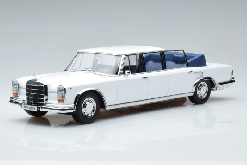 The Mercedes 600 Pullman W100 Landaulet Wit KK-Scale 1:18 is crafted from Metaal. Die-cast zinc alloy body with detailed plastic parts, rubber tires, and high-quality paint finish. Die-cast models are known for their weight, durability, and realistic feel.