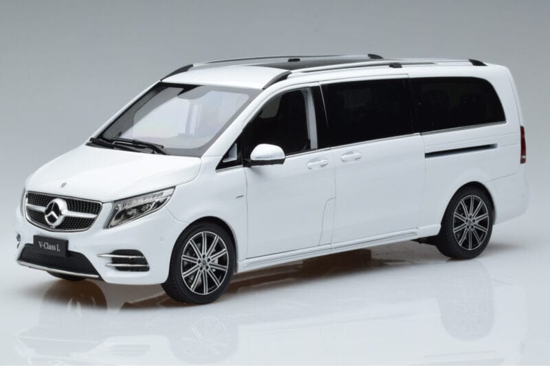 The Mercedes V-Class W447 V260L Wit Mercedes 1:18 is crafted from Metaal. Die-cast zinc alloy body with detailed plastic parts, rubber tires, and high-quality paint finish. Die-cast models are known for their weight, durability, and realistic feel.