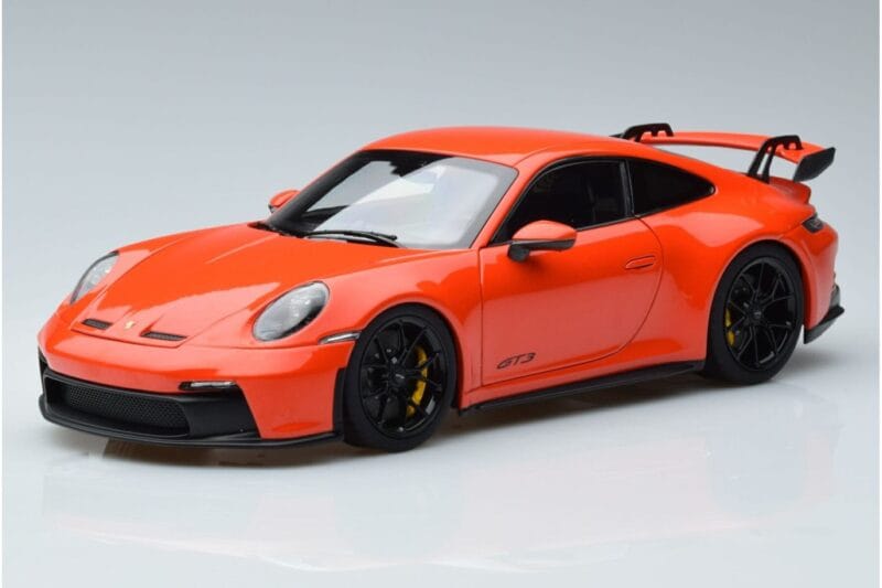 The Porsche 911 992 GT3 Oranje Norev 1:18 is crafted from Metaal. Die-cast zinc alloy body with detailed plastic parts, rubber tires, and high-quality paint finish. Die-cast models are known for their weight, durability, and realistic feel.
