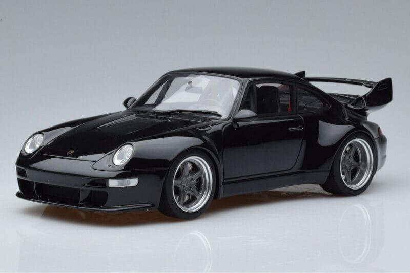 A 1:18 scale model measures approximately 25-28 cm (approximately 10-11 inches). The Porsche 911 993 Gunther Werks 400R Zwart GT Spirit 1:18 is perfect for display in a glass cabinet or on a shelf.