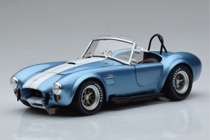 The Shelby Cobra 427 S/C Lichtblauw Kyosho 1:18 is crafted from Metaal. Die-cast zinc alloy body with detailed plastic parts, rubber tires, and high-quality paint finish. Die-cast models are known for their weight, durability, and realistic feel.