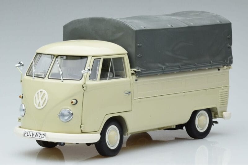 The Volkswagen T1b Pickup Schuco 1:18 is crafted from Metaal. Die-cast zinc alloy body with detailed plastic parts, rubber tires, and high-quality paint finish. Die-cast models are known for their weight, durability, and realistic feel.